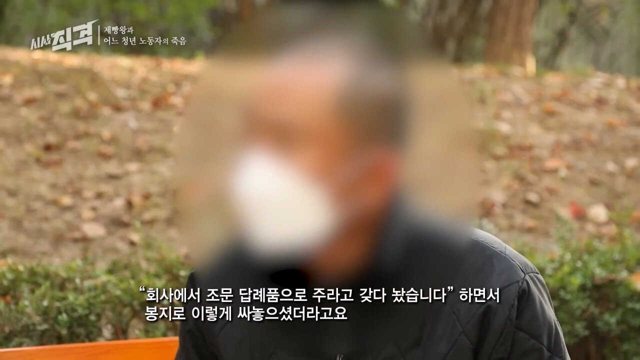 유족의 이 말이 모든 것을 설명합니다. 빵을 만들다가 죽은 사람의 장례식에 그 회사에서 만든 빵을 답례품으로 가져온 것이에요.